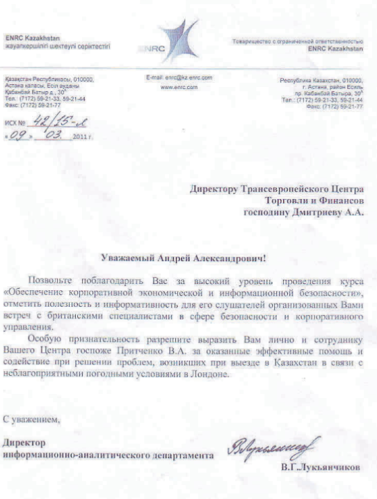 We would particularly like to extend our gratitude to you personally and to your colleague, Ms. Prichina V.A., for the effective assistance provided in resolving issues that arose during our departure from London to Kazakhstan due to adverse weather conditions.