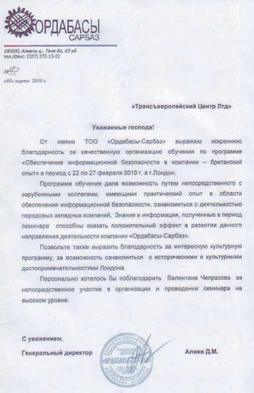 On behalf of Ordabasy-Sarbaz LLP, we would like to express our sincere appreciation for the high-quality organisation of the training programme “Information Security Management in a Company – British Experience”, which took place from 22 to 27 February 2010 in London.