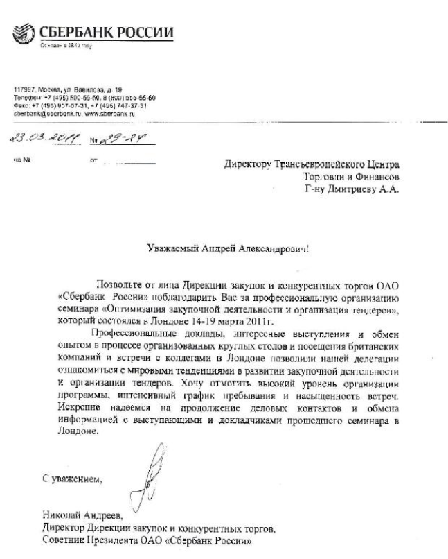 On behalf of the Procurement and Competitive Bidding Department of Sberbank of Russia JSC, we would like to express our sincere appreciation for the professional organisation of the seminar “Optimisation of Procurement Activities and Tender Management”, which took place in London from 14 to 19 March 2011.